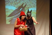 Da un telo bianco spuntano quattro piedi e quattro mani. Indossano guanti e calzini blu e verdi. Le due attrici sono in scena, ma non hanno deciso quale spettacolo rappresentare. Cappuccetto Blu o Cappuccetto Verde? S’imbatteranno anche in un nevoso Cappuccetto Bianco, poi finalmente sul palco comparirà la bimba con il cappuccio rosso.